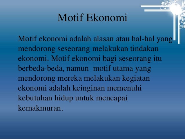 Motif ekonomi ialah dorongan seseorang untuk melakukan kegiatan atau tindakan ekonomi. Dari slsabilla68 08.05.2019 masuk untuk menambahkan. Pelaku ekonomi dalam kegiatan ekonomi selain mempunyain peran, mereka jugamempunyai motif ekonomi. Berikut yang termasuk dalam motif ekonomi bagi pengusaha ialah (b) 1. Dalam ekonomi konvensional, seorang produsen atau firm memiliki satu tujuan utama yaitu untuk memaksimasikan profit.