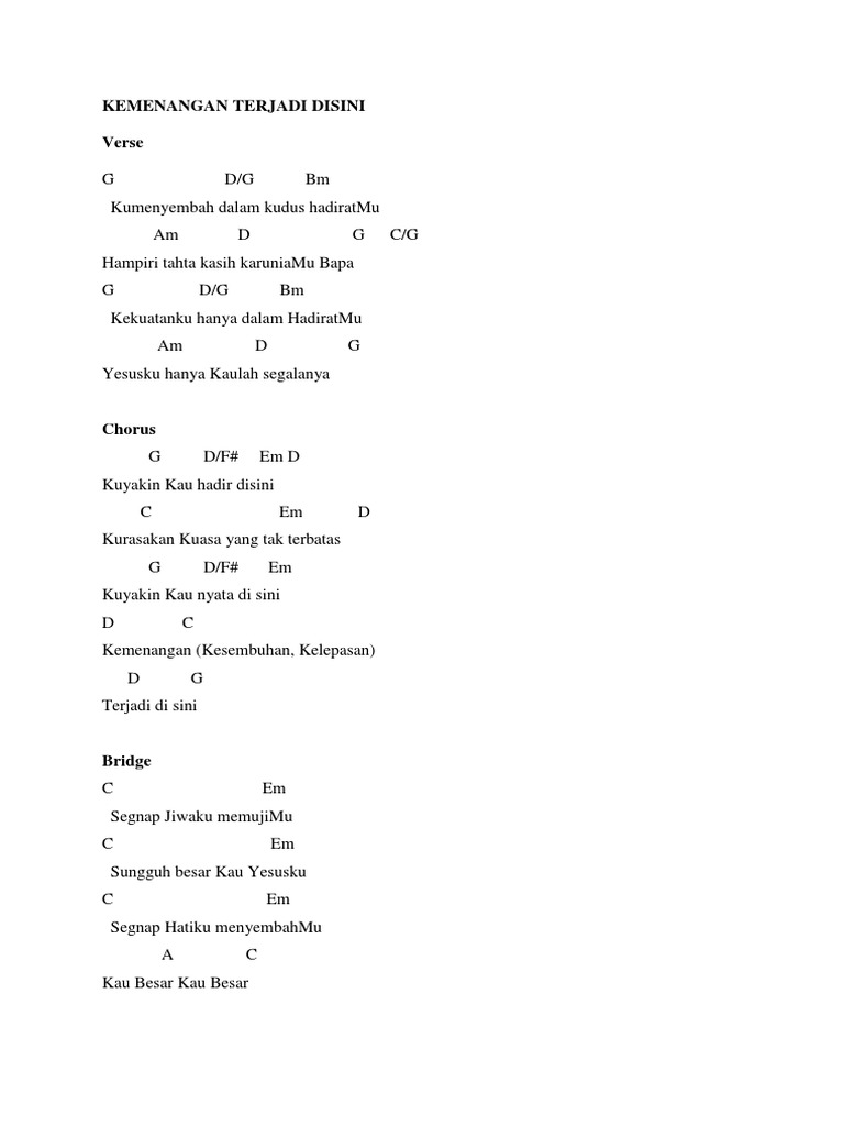 G gmaj7 bm kumenyembah dalam kudus hadiratmu am d g c/g hampiri tahta kasih karuniamu bapa g gmaj7 bm kekuatanku hanya dalam hadiramu am d g yesusku hanya kaulah segalanya reff : Make strumming patterns to the song using the editor; Lirik kemenangan terjadi di sini. Create and get +5 iq. Kuyakin kau hadir disini kurasakan kuasa yang tak terbatas G d/f# em d kuyakin kau hadir di sini c em d kurasakan kuasa yang tak terbatas g d/f# em kuyakin kau nyata di sini d c d g kemenangan terjadi di sini c em seg'nap jiwaku memujimu c em sungguh besar kau yesusku c em Kuyakin kau nyata di sini kemenangan terjadi disini. Gitar chords cari blog ini. Kemenangan (kesembuhan, kelepasan) terjadi di sini. 11,428 views, added to favorites 71 times. C ku yakin saat kau berfirman dm ku menang saat kau bertindak c/e f g hidupku hanya ditentukan f/c c. Em dandani sayap cinta yang patah. Verse kumenyembah dalam kudus hadiratmu hampiri tahta kasih karuniamu bapa kekuatanku hanya dalam hadiratmu yesusku hanya kaulah segalanya chorus kuyakin kau hadir disini kurasakan kuasa yang tak terbatas kuyakin kau nyata di sini kemenangan (kesembuhan, kelepasan).