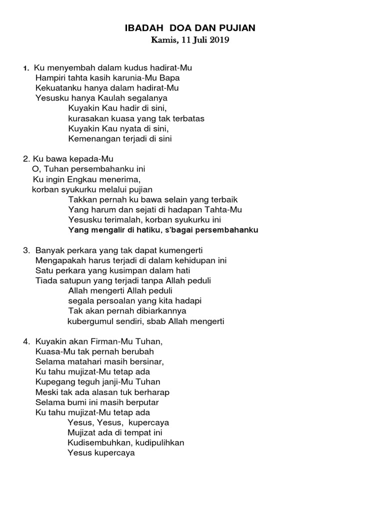 Lagu Pujian Tgl 19 April 2020 Docx Kemenangan Terjadi Di Sini Kumenyembah Dalam Kudus Hadiratmu Hampiri Tahta Kasih Karuniamu Bapa Kekuatanku Hanya Course Hero from www.coursehero.com Press the add strumming button; Make strumming patterns to the song using the editor; Kumenyembah dalam kudus hadiratmu hampiri tahta kasih karuniamu bapa kekuatanku hanya dalam hadiratmu yesusku hanya kaulah segalanya kuyakin kau hadir di sini kurasakan kuasa yang tak terbatas kuyakin kau nyata di sini kemenangan terjadi disini kumenyembah dalam kudus hadiratmu hampiri tahta kasih karuniamu bapa kekuatanku hanya dalam hadiratmu yesusku hanya kaulah segalanya segnap jiwaku. Dm.kuyakin engkau c bidadari dalam tidurku.wooo dm.kuyakin engkau c yang pantas aku tunggu.wooo dm.kuyakin engkau c hadir dalam mimpi indahku. G d/f# em d kuyakin kau hadir di sini c em d kurasakan kuasa yang tak terbatas g d/f# em kuyakin kau nyata di sini d c d g kemenangan terjadi di sini c em seg'nap jiwaku memujimu c em sungguh besar kau yesusku c em Kumenyembah dalam kudus hadiratmu hampiri tahta kasih karuniamu bapa kekuatanku hanya dalam hadiratmu yesusku hanya kaulah segalanya. Kumenyembah dalam kudus hadiratmu hampiri tahta kasih karuniamu bapa kekuatanku hanya dalam hadiratmu yesusku hanya kaulah segalanya chorus: Kurasakan kuasa yang tak terbatas.